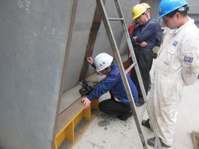 2015年3月31日,寧波市交通建設工程試驗檢測中心有限公司一行3人組成檢測組,前往位于江蘇省南通市如皋市的中國中鐵山橋重工集團有限公司,對在山橋公司生產(chǎn)的寧波梅山春曉大橋鋼桁架拱橋進(jìn)行廠(chǎng)內抽檢。檢測組隨機抽取了已經(jīng)過(guò)自檢合格的焊縫進(jìn)行超聲波無(wú)損檢測和X射線(xiàn)檢測(其中超聲波檢測25m,X射線(xiàn)拍片6張),并查看了第三方相關(guān)資料。檢測組與現場(chǎng)人員充分討論,并根據廠(chǎng)內焊接實(shí)際,大家一致認為自檢和第三方檢測對鋼結構非常重要,及時(shí)避免了不合格產(chǎn)品的出廠(chǎng)。