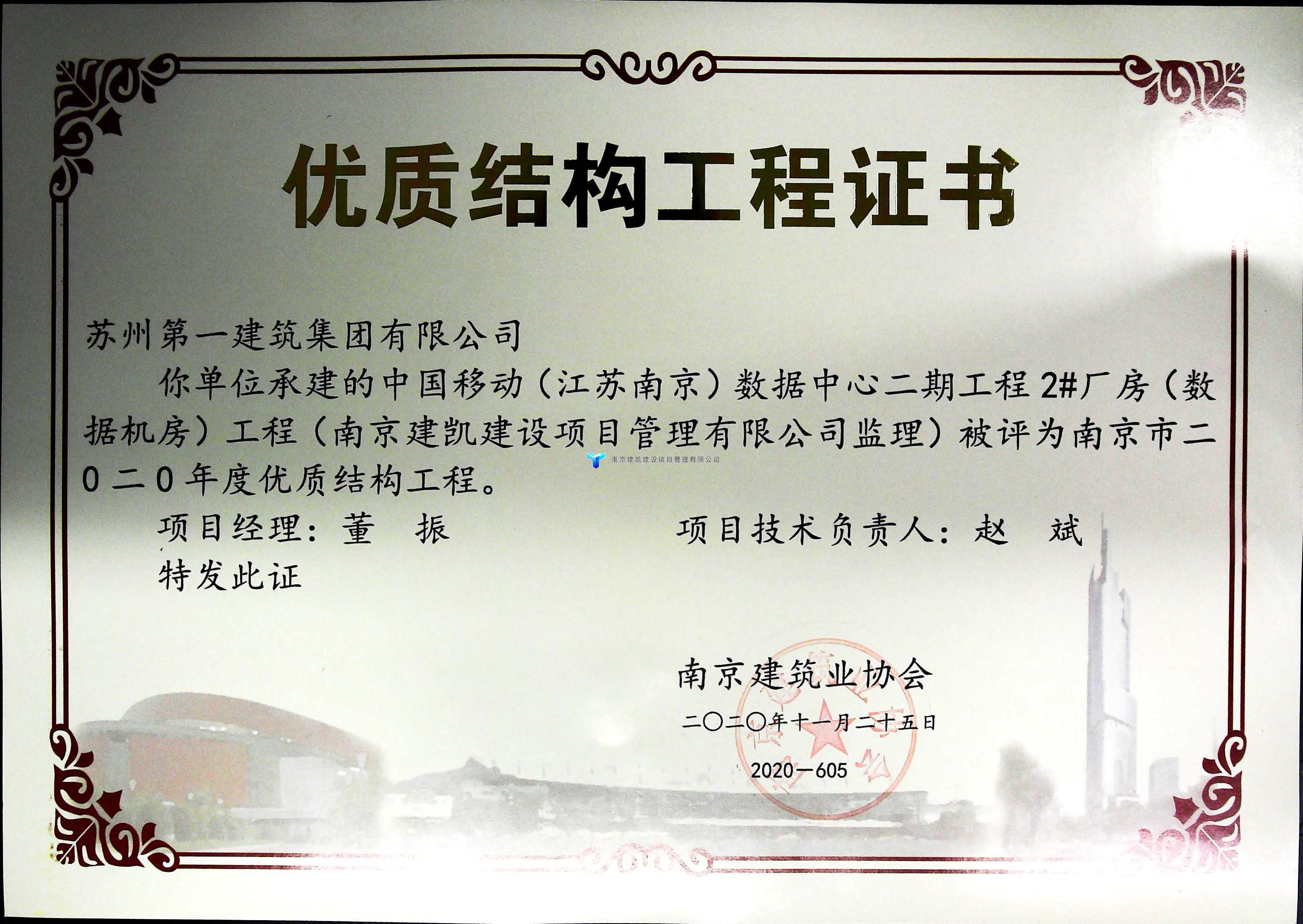 2020年榮獲優(yōu)質(zhì)結(jié)構(gòu)工程的項(xiàng)目——中國(guó)移動(dòng)(江蘇南京)數(shù)據(jù)中心二期工程2#廠房