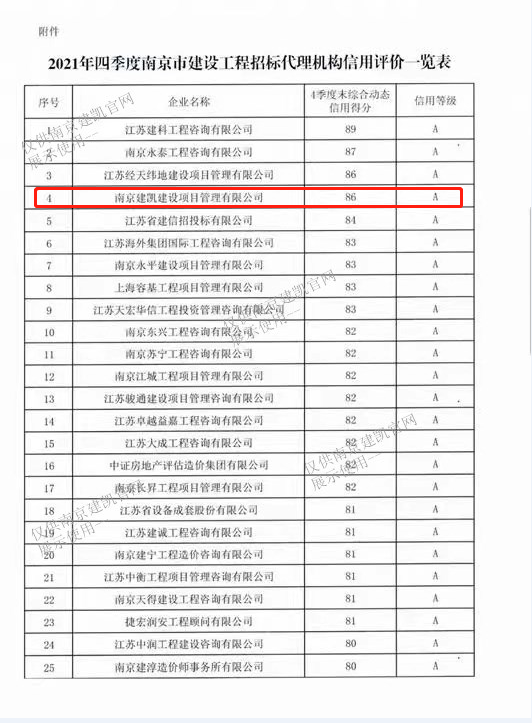熱烈祝賀我司招標(biāo)代理在“2021年四季度南京市建設(shè)工程招標(biāo)代理機(jī)構(gòu)信用評(píng)價(jià)”中榮獲A級(jí)。