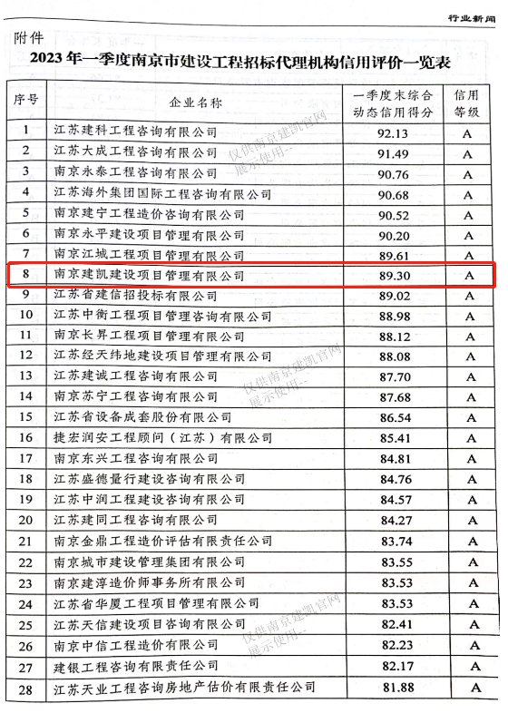 熱烈祝賀我司招標(biāo)代理機(jī)構(gòu)在2023年第一季度南京市建設(shè)工程招標(biāo)代理機(jī)構(gòu)信用評(píng)價(jià)綜合得分89.30分,全市排名第八名