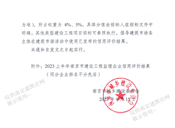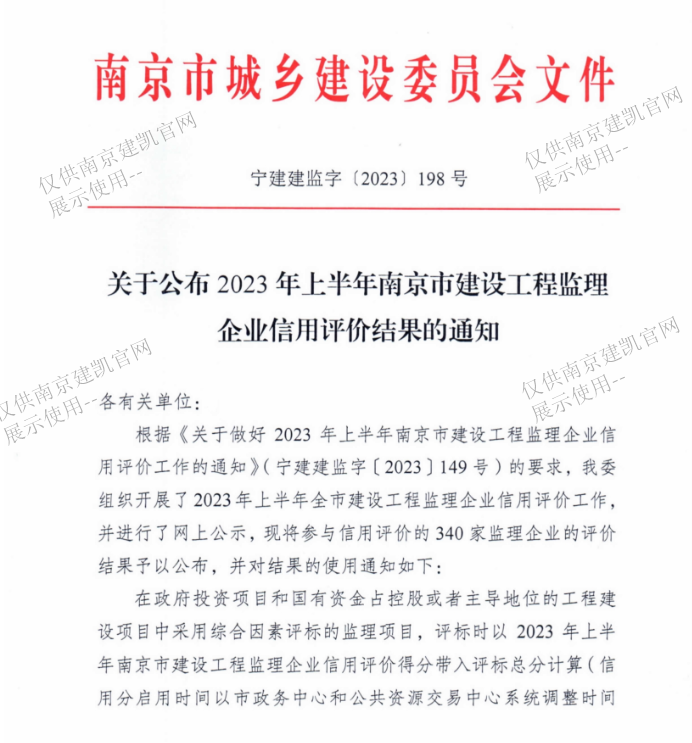 我司監(jiān)理企業(yè)在2023年上半年南京市建設(shè)工程監(jiān)理企業(yè)信用評價綜合得分88.30分