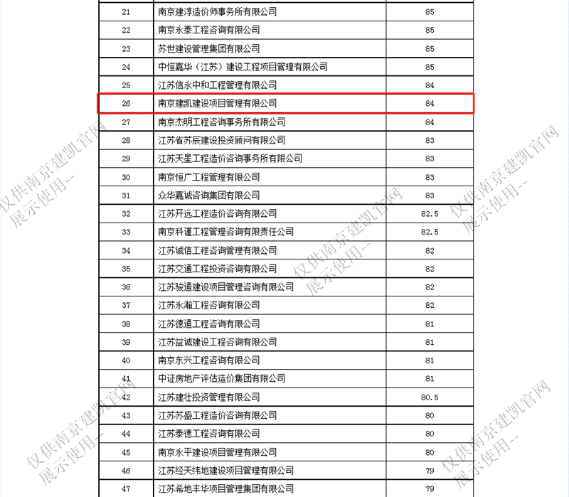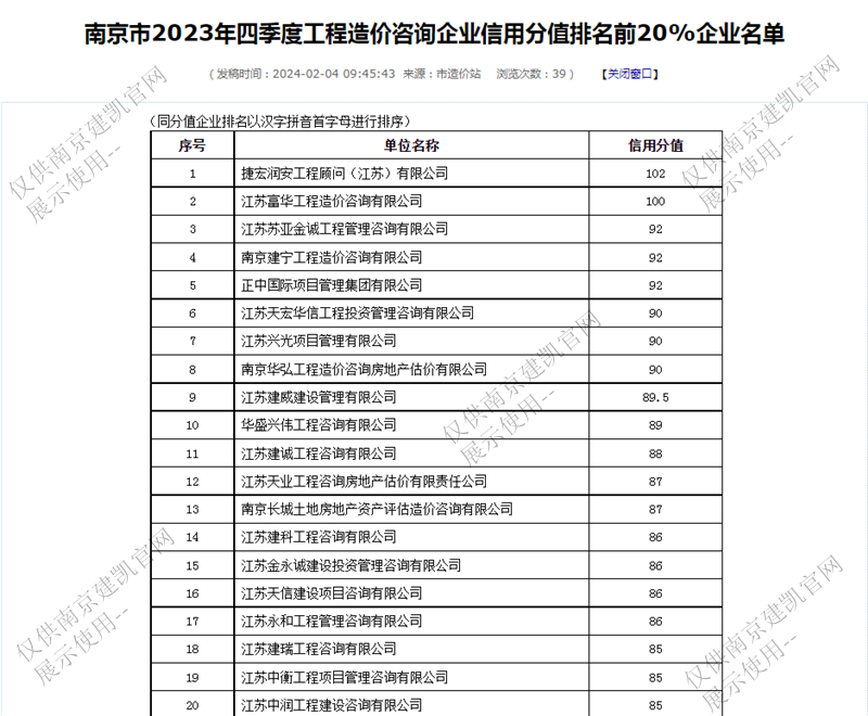 恭喜我司入選“南京市2023年四季度工程造價(jià)咨詢企業(yè)信用分值排名前20%企業(yè)名單”