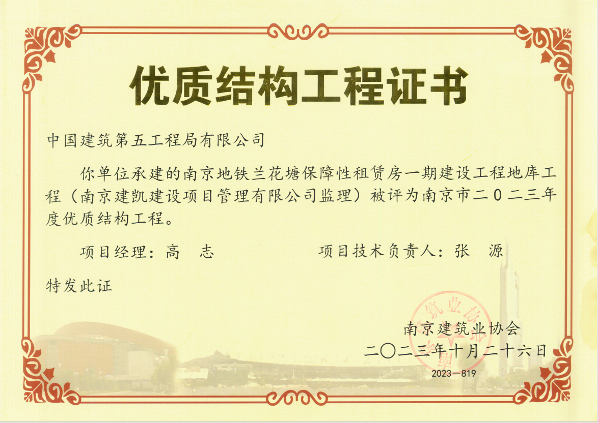 南京地鐵蘭花塘保障性租賃房一期建設工程 1#樓工程榮獲“優(yōu)質(zhì)結(jié)構(gòu)工程證書”