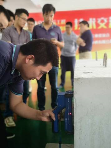現場(chǎng)技術(shù)交流環(huán)節,活動(dòng)主辦方準備了標準鋼筋混凝土構件,與會(huì )技術(shù)人員使用自帶的鋼筋保護層厚度檢測儀進(jìn)行檢測,通過(guò)結果比對,尋差距、找問(wèn)題,共同探討交流平時(shí)檢測工作中遇到的疑難點(diǎn)。