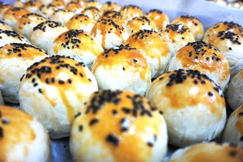 大家在面點(diǎn)師傅的指導下紛紛“大顯身手”,揉面、搟皮、包圓,不在話(huà)下。不一會(huì )兒功夫,“檢測牌”手工蘇月都已整整齊齊碼在盤(pán)里。平日里,抹砂漿的能工巧匠這回成了抹蛋液的能手,給月餅上妝添彩。