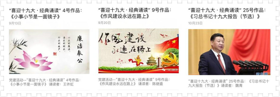 公司黨總支自9月中旬開(kāi)始,在公司自主開(kāi)發(fā)的微信公眾號推送“喜迎十九大·經(jīng)典誦讀”活動(dòng)。每日推送一名黨員同志朗誦的習近平系列講話(huà)等經(jīng)典作品,并在公司“紅色根據地”黨員微信群和QQ群中組織黨員對所誦讀內容進(jìn)行討論?;顒?dòng)極大地激發(fā)了黨員干部們學(xué)理論、用理論的熱情。大會(huì )召開(kāi)期間,十九大報告原文更是成了黨員們首選的誦讀作品。