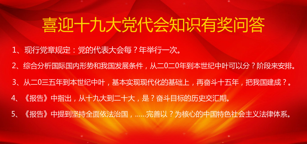 大會(huì )期間,公司黨總支還開(kāi)展了“喜迎十九大知識競賽”活動(dòng),競賽題目以習總書(shū)記十九大報告為主要內容,黨員QQ群每日線(xiàn)上搶答,黨員干部參與熱情高漲,積極踴躍答題,營(yíng)造了濃濃的大會(huì )氛圍,也加深了大家對十九大報告的學(xué)習效果。