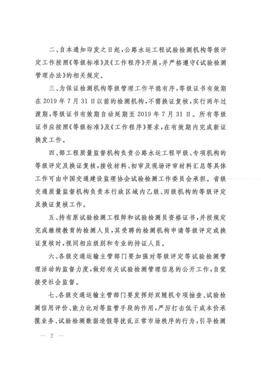 根據《交通運輸部辦公廳關(guān)于做好當前公路水運工程試驗檢測工作有關(guān)事項的通知》(交辦安監函[2017]1124號)文件精神,公司現有等級證書(shū)有效期自動(dòng)延期至2019年7月31日,請知悉。